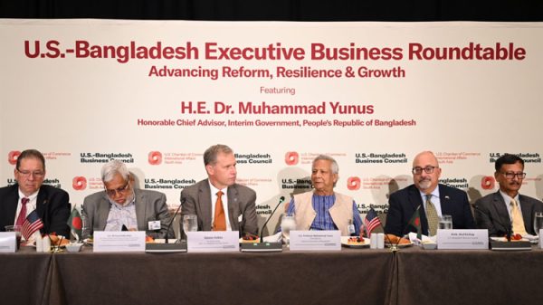 ধান উপদেষ্টা অধ্যাপক মুহাম্মদ ইউনূস যুক্তরাষ্ট্রের কোম্পানিগুলোকে বাংলাদেশে আরও বিনিয়োগের আহ্বান জানিয়েছেন।বুধবার নিউইয়র্কে অনুষ্ঠিত যুক্তরাষ্ট্র-বাংলাদেশ এক্সিকিউটিভ বিজনেস গোলটেবিল আলোচনায় বক্তব্য রাখতে গিয়ে তিনি এ আহ্বান জানান। ‘অ্যাডভান্সিং রিফর্ম, রেজিলিয়েন্স অ্যান্ড
