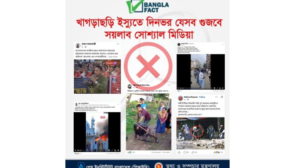 খাগড়াছড়ি ইস্যুতে নানা গুজবে সয়লাব সোশ্যাল মিডিয়া বা সামাজিক যোগাযোগমাধ্যম। প্রেস ইনস্টিটিউট বাংলাদেশ (পিআইবি) ফ্যাক্ট চেক ও মিডিয়া রিসার্চ টিম বাংলাফ্যাক্ট সেগুলো শনাক্ত করেছে। বাংলাফ্যাক্ট জানায়, খাগড়াছড়ি ইস্যুতে নানা গুজব