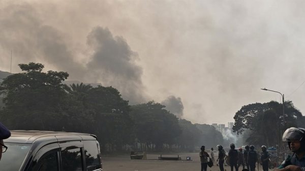 জুলাই সনদ স্বাক্ষর অনুষ্ঠানকে কেন্দ্র করে পুলিশের সঙ্গে জুলাই যোদ্ধাদের সংঘর্ষে ব্যারিকেডের জন্য ব্যবহৃত ‘রোড ব্লকার’গুলো একত্রিত করে আগুন ধরিয়ে দিয়েছেন আন্দোলনকারীরা। এতে ওই সড়কে যান চলাচল পুরোপুরি বন্ধ হয়ে